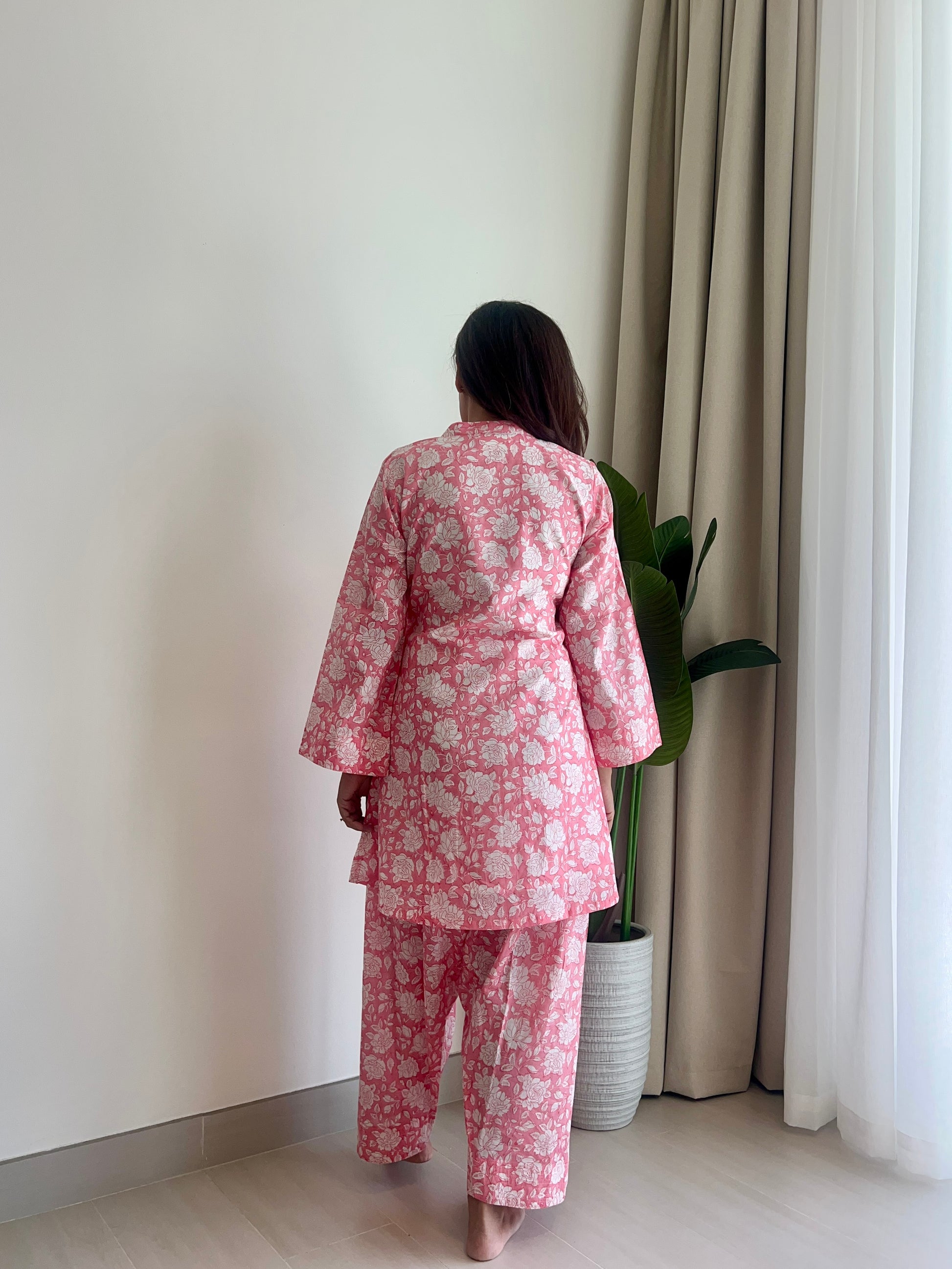 A modern take on tradition, this block-printed Farshi salwar set comes in a calming blush pink with fine white floral motifs. The lined kurta features a Nehru collar, openable buttons, and subtle thread detailing at the sleeves and hem, while the unlined Farshi bottoms keep the silhouette light and flowy. Effortless, versatile, and timeless — perfect for easy days and understated gatherings.