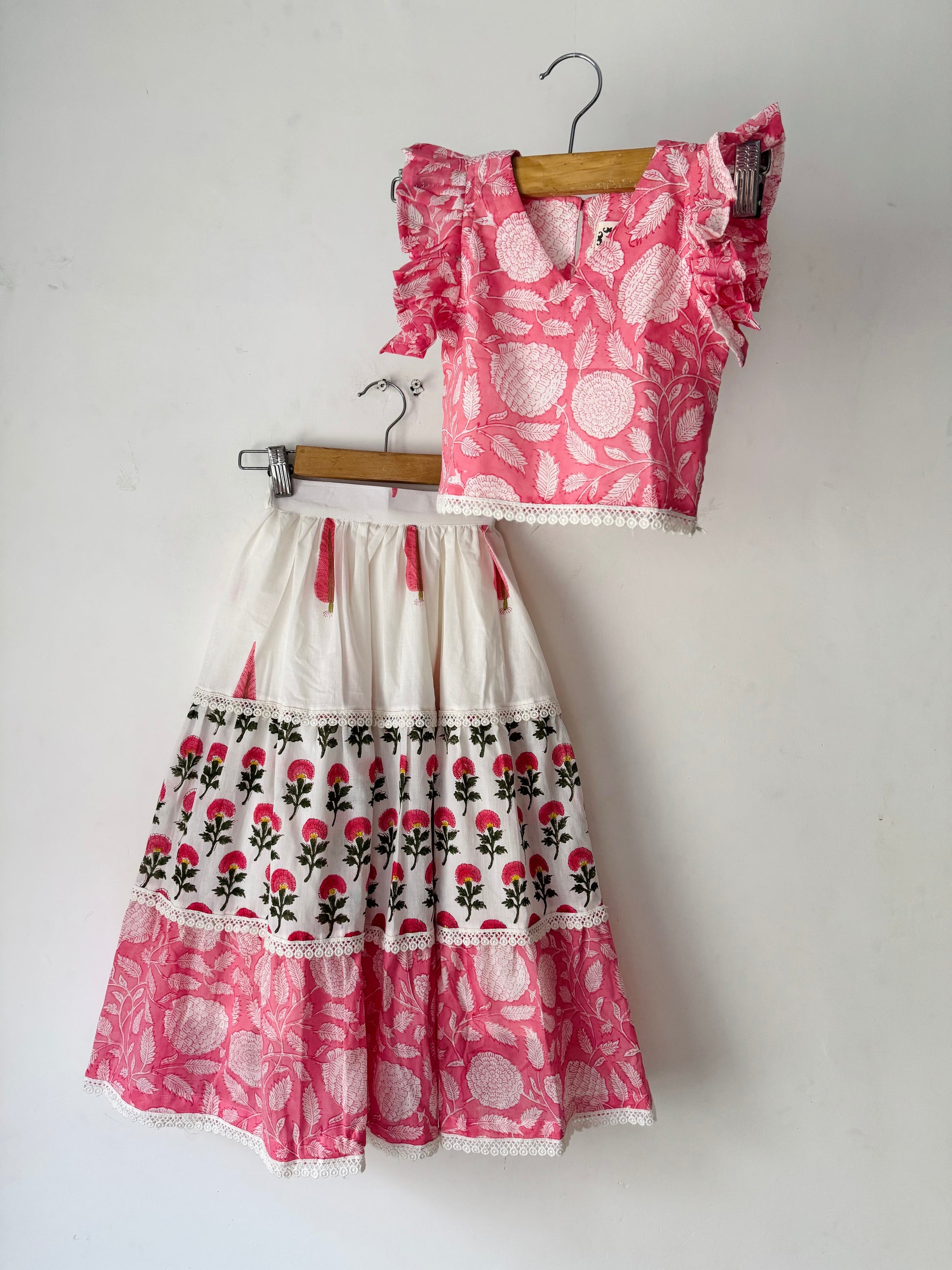 A pink block printed  top with flutter sleeves detailed with lace. It is paired with a pink tiered block printed elastic skirt.
