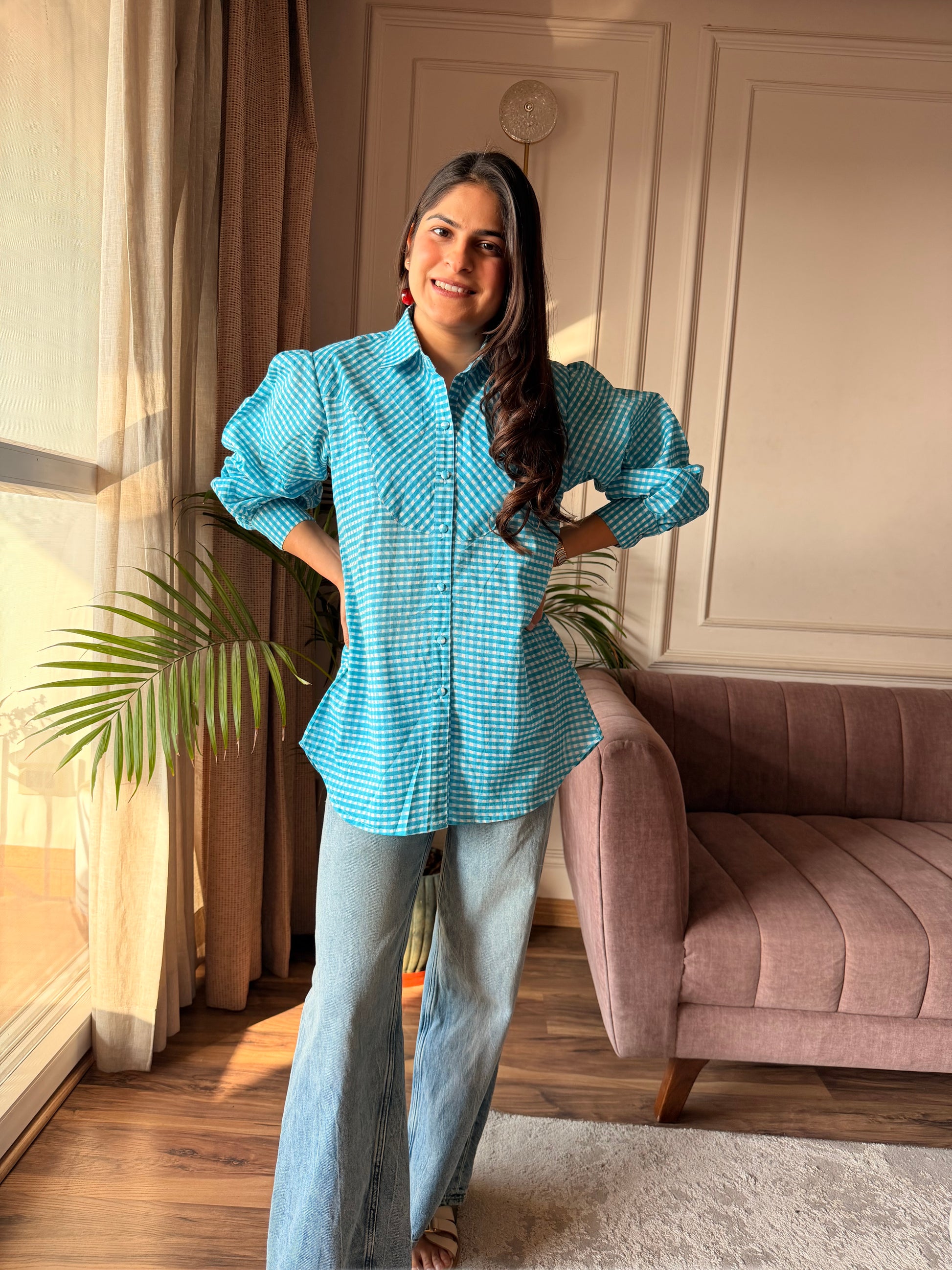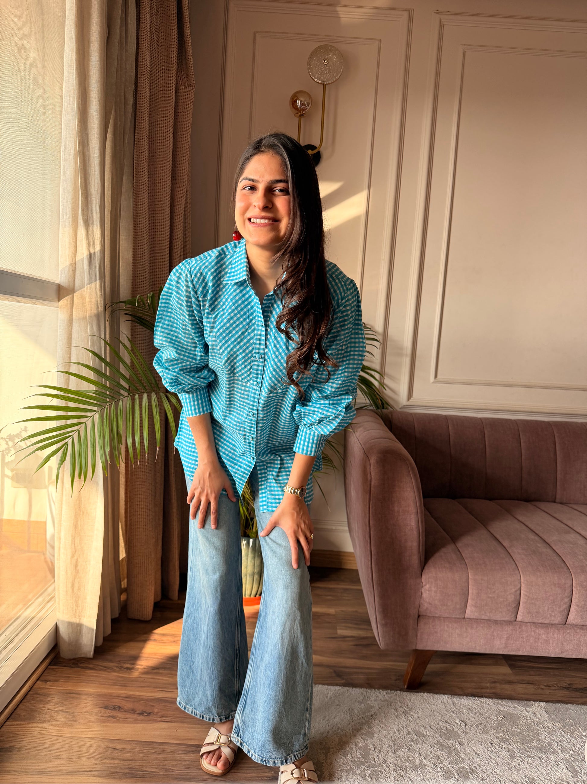 Fresh and calming, this blue gingham shirt brings a breezy charm to everyday wear. Its relaxed silhouette, breathable cotton fabric, and tailored cuffs make it an easy choice for warm-weather styling.