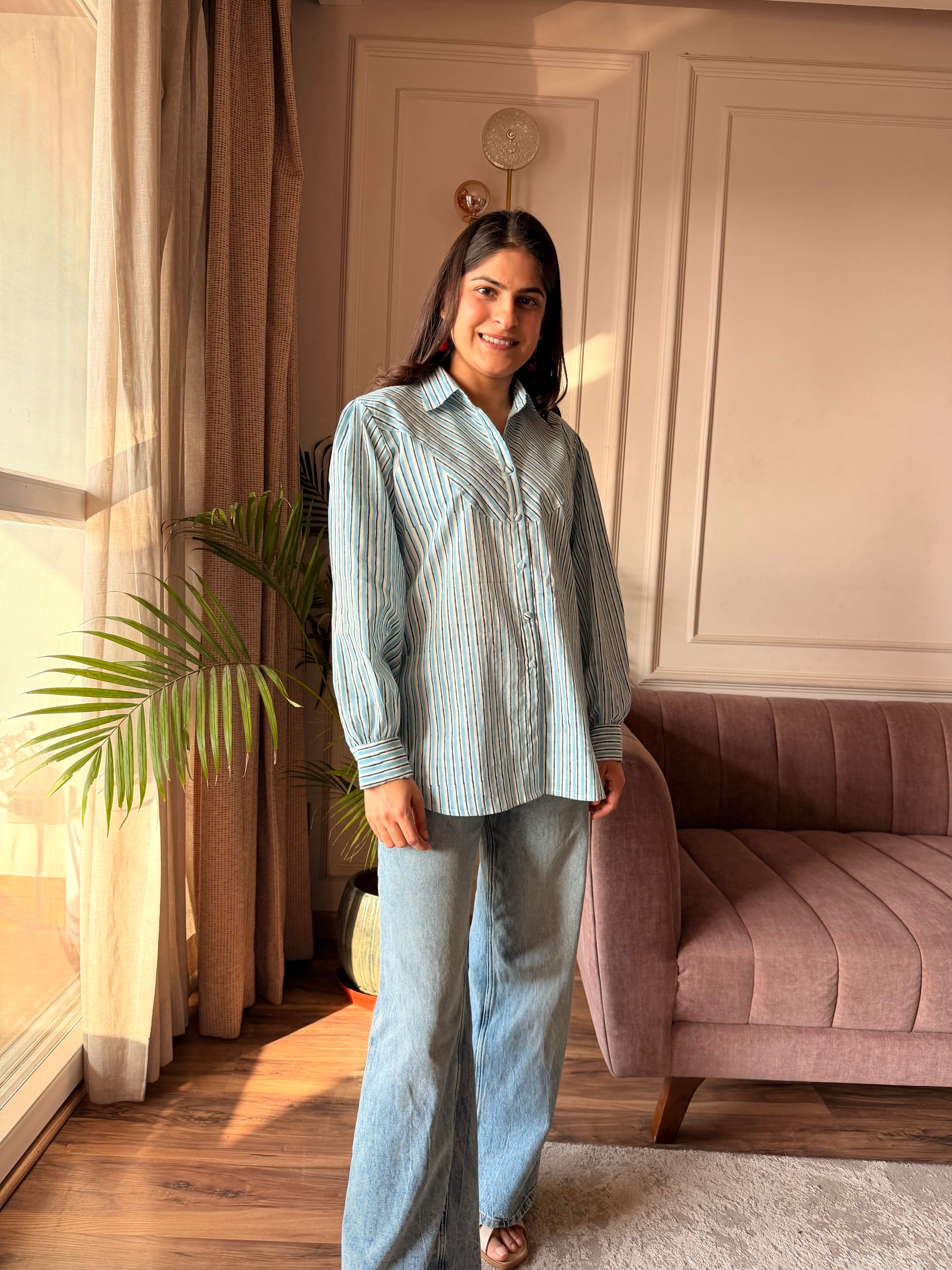 A serene take on classic stripes, the Skyfall Stripe Shirt features cool blue tones and a fluid, relaxed fit. Designed with full sleeves and refined detailing, it’s perfect for polished yet easygoing styling.